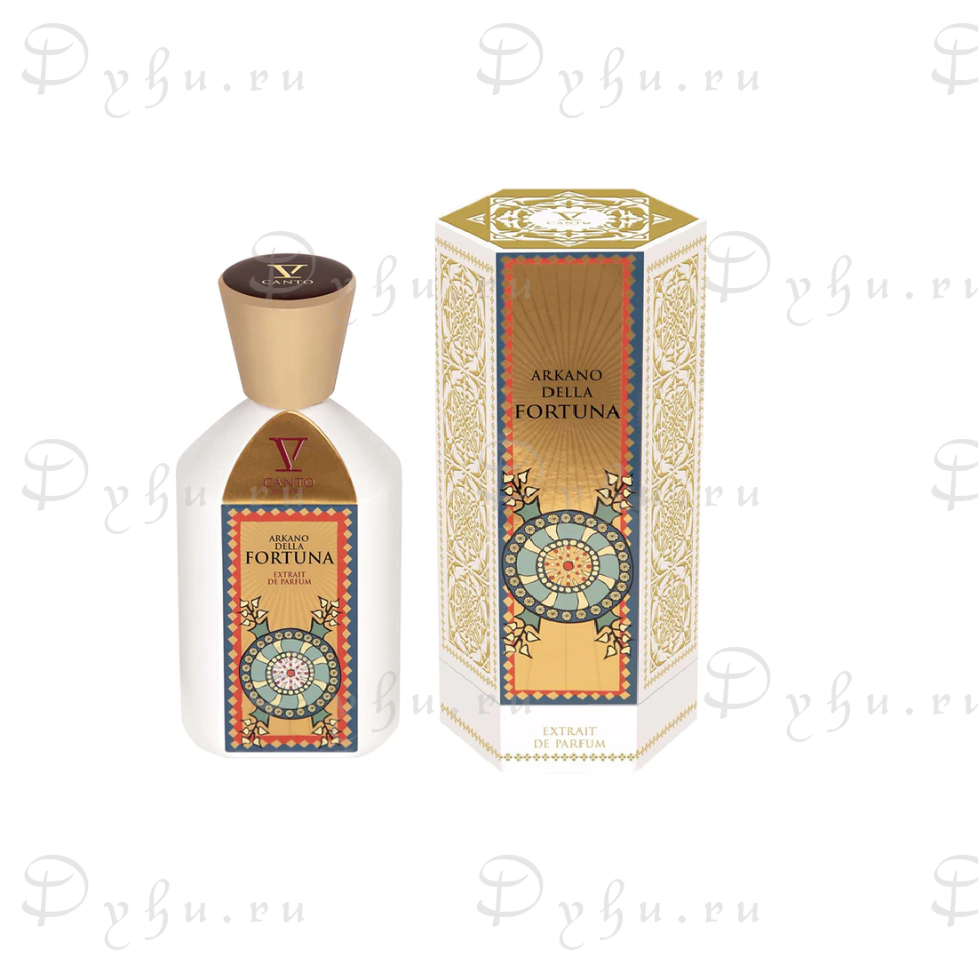 Парфюм открывается игристыми нотами итальянских цитрусовых: бергамот из Калабрии с его пикантными, игристыми и слегка горьковатыми нотами сочетается с мандарином, который добавляет сладости и живости. Лимон из Сорренто, символизирующий свежесть и солнечную энергию, завершает это трио цитрусовых и обеспечивает взрывное начало. В сердце V Canto Arkano Della Fortuna ощущаются спокойствие и безмятежность, вызванные лавандой озера Гарда в сочетании с опьяняющей сладостью индийского жасмина самбака и королевской амброй. В базе мускус смешивается с бразильским бальзамом толу, дающем тепло и глубину. Франжипани добавляет экзотический, цветочный оттенок своими сливочными, притягательными нотами, в то время как береза добавляет намек на силу и деликатность, запечатывая аромат прочной, обволакивающей базой.